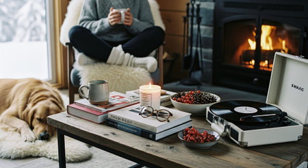 A cozy living room with a person sitting cross-legged holding a cup, a golden retriever on a rug, a record player on a table with books, candles, snacks, and a fireplace in the background