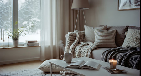 Cozy living room interior with comfortable sofa, coffee cup, knitted plaid, book, candles and window with snow