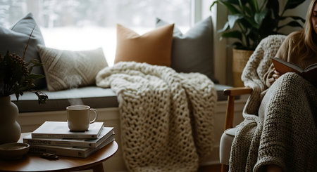 Cozy home interior. Cozy living room with sofa, coffee cup, books and knitted plaids.
