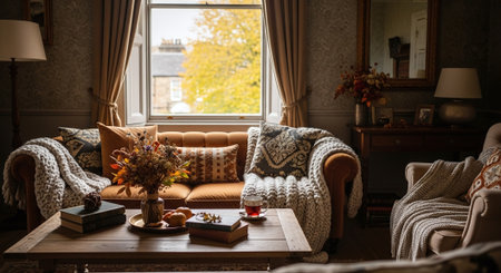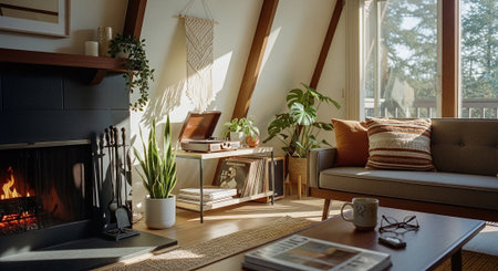 Cozy living room with warm decor and natural lighting. That the image is generated using AI.