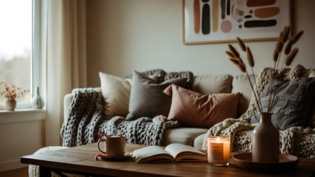 Cozy living room interior with sofa, coffee cup, book and candles