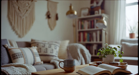 A warm, inviting living room with a couch, pillows, an open book, a coffee mug, and potted plants. Natural light and decorative wall hangings enhance the cozy atmosphere.