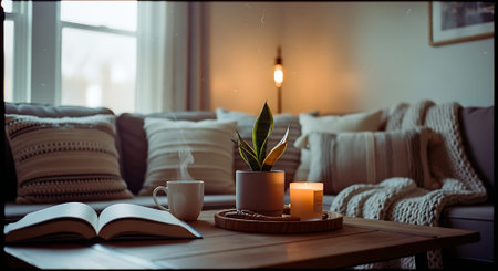 A warm living room scene with an open book, coffee cup, potted plant, and lit candle on a wooden coffee table. Soft lighting and comfortable cushions create a relaxing atmosphere.