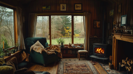 A warm living room featuring a lit fireplace, comfortable chairs with blankets, a coffee table with books and a mug, and large windows allowing natural light.