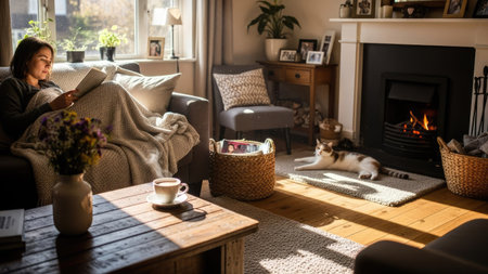 A woman is seen reading a book while relaxing on a sofa in a warmly lit living room. The scene includes a fireplace, a cat, and a coffee table. The image features natural light and a comfortable interior setting. This image could be used for various commercial projects related to home decor or lifestyle content.