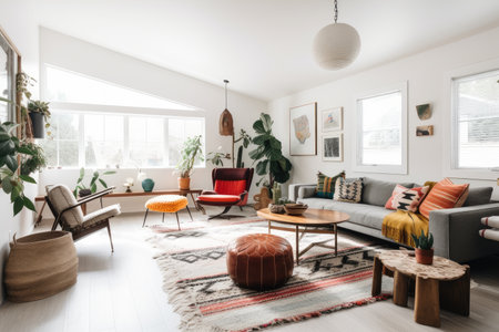 modern and minimalist bohemian home with sleek furniture, natural light, and pops of color, created with generative ai
