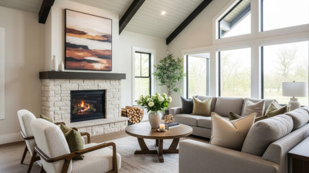 A bright living room showcases a modern interior design featuring comfortable seating and a fireplace. The scene is illuminated by natural light, emphasizing the textures of the furniture and artwork. This versatile space is suitable for various commercial uses, including lifestyle and home decor projects.