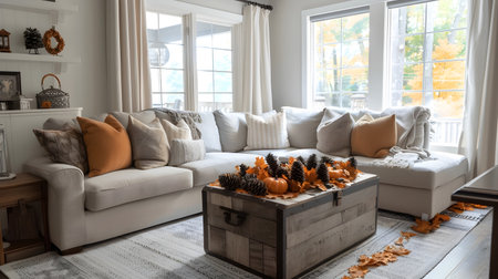 A cozy living room with modern decor, featuring large windows showcasing autumn foliage, stylish furniture, and decorative plants