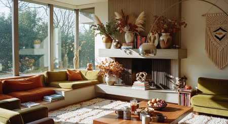 A cozy living room featuring a mid-century modern design with warm colors, a fireplace, decorative vases, and autumn-themed decor