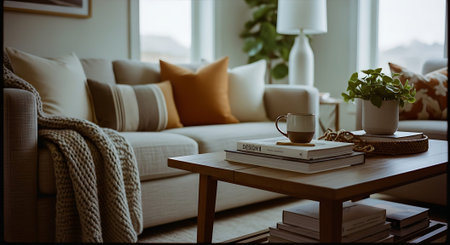 A warm and inviting living room featuring a beige sofa with pillows, a wooden coffee table with books, a mug, and a plant.