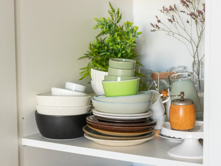 A kitchen shelf with diverse stacks of ceramic plates, bowls, and cups in neutral colors, alongside a green potted plant and a wooden spice mill