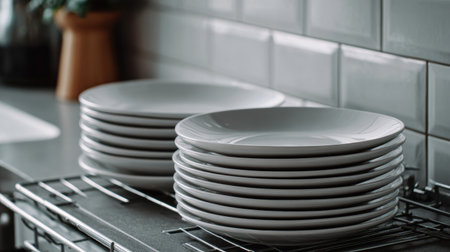 Stacks of clean plates dry on a rack in a modern kitchen with a minimal design, showing a sleek and organized space.