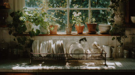 Dishes are arranged on a drying rack in a warm kitchen, illuminated by sunlight streaming through the window, with greenery surrounding the scene.