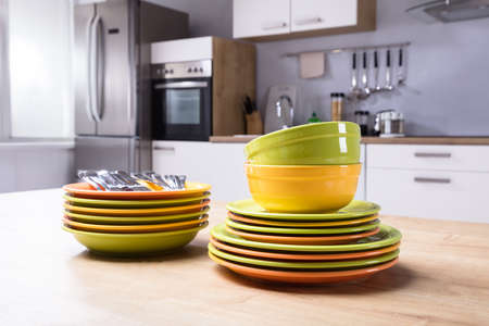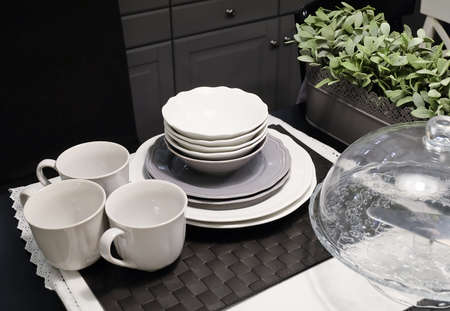 Ceramic tableware on the table in a modern kitchen.