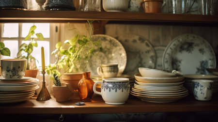 A serene rustic kitchen scene showcasing vintage crockery and cookware, beautifully illuminated by natural sunlight. A perfect blend of warmth and charm.