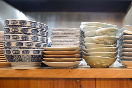 Kitchen Utensil, Table Set of Ceramic Dishes, Bowls, Plates and and Coffee Cups Preparing for Serve Hot and Cold Food.