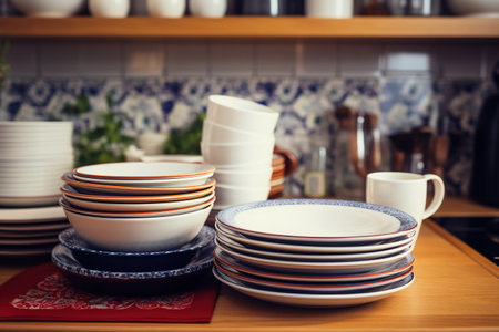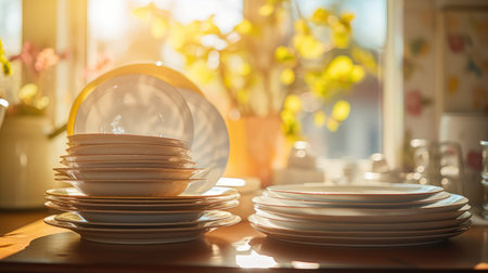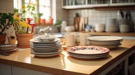 Stack of clean dishes in the kitchen. AI generative
