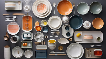 Set of ceramic tableware on gray background. View from above.