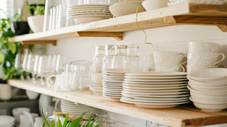 Bright sunlight bathes the kitchen, highlighting a delightful arrangement of stacked plates, bowls, and cups. The wooden shelves in the background showcase various utensils and plants, creating a warm and inviting ambiance perfect for a leisurely breakfast or gathering with friends.