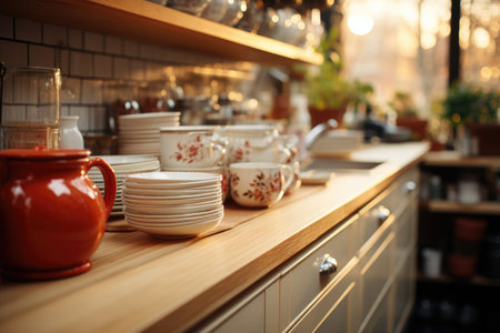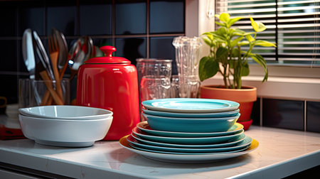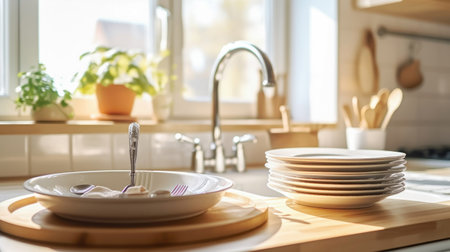 Discover the art of kitchen order as dishware is lovingly organized on the counter, near the sink, and by the window sill. It's a testament to the calm and serenity that a clean kitchen can provide. illustration created by Generative AI