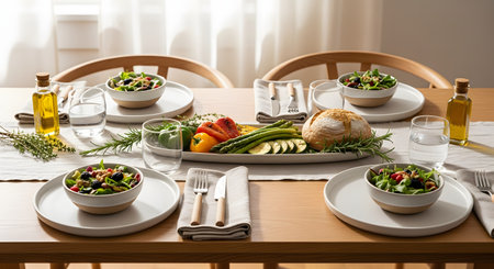 A neatly arranged dining table set for a healthy meal with bowls of fresh salad, a platter of grilled vegetables, and a rustic loaf of bread. Olive oil bottles and simple white tableware create a clean, organic atmosphere.
