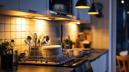 Cozy modern kitchen features a dish rack filled with utensils and plates, illuminated by soft ambient lighting, creating a serene cooking space.