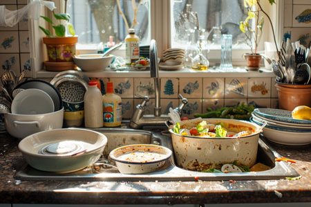 A vibrant kitchen scene capturing a cluttered countertop filled with dirty dishes and cookware, highlighting the joy and chaos of home cooking and meal preparation.