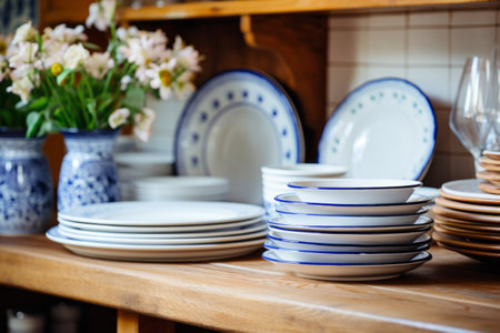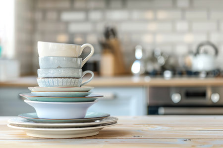 Clean and Organized: Stacks of White Dishes on Shiny Kitchen Counter