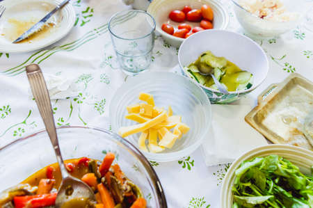 Salad,fish, vegetables and eggs on the table. Russian and Ukrainian food