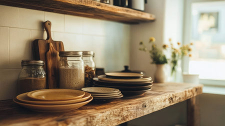 A cozy kitchen scene featuring a rustic shelf adorned with assorted plates, glass jars, and wooden utensils, illuminated by natural light for an inviting atmosphere.