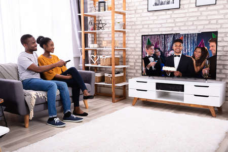 Happy African Couple Sitting On Sofa Watching Television At Home