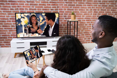 Couple Streaming Movie From Tablet To TV Using Wireless Connection