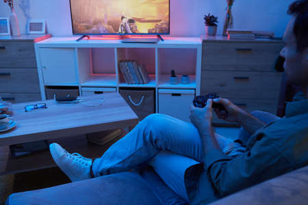 man playing video game at home sitting on coach sofa in front of television with play game concole and joystick in hands