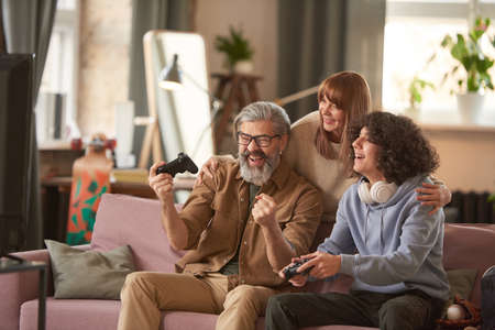 Dad is happy with his victory in the game he winning his son while they playing video games together at home