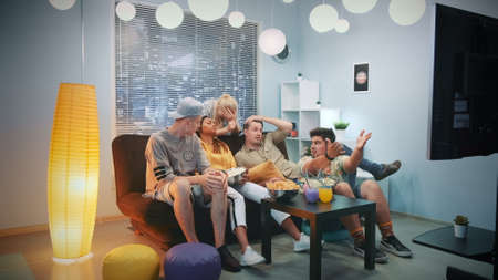 Group of friends watching TV, sport match together. Emotional fans cheering for favorite team, watching exciting football. Concept of friendship, leisure activity, emotions. Betting, finance, fun.