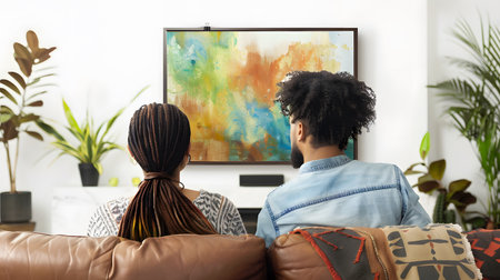 Rear view of African couple sitting on sofa with glasses of red wine and looking at widescreen TV hanging on the wall, they watching movie in the evening