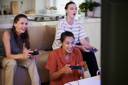 Diverse people sitting in living room while enjoying gaming on electronic entertainment device. Playful multiethnic group of friends sitting on sofa while playing console videogames with controller.