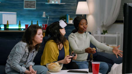 Black woman experiencing virtual reality headset winning video games using gaming joystick. Mixed race group of friends hanging out together drinking beer having fun late at night in living room