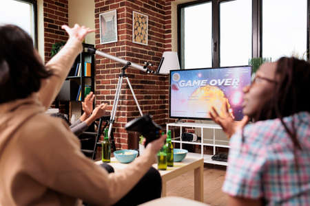 Angry woman reacting to game over screen while losing videogame round on modern console. Diverse gamers upset about lost game while sitting on sofa in living room with close friends group.