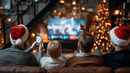 A family enjoys a cozy Christmas evening, watching movies on television while wearing Santa hats, surrounded by festive decorations.