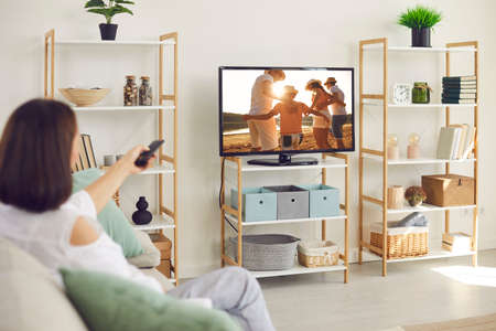 Woman watching film on television at home. Relaxed lady sitting on sofa in living room, watching movie, series, serial or collection of photo memories of family summer holiday on big widescreen TV set