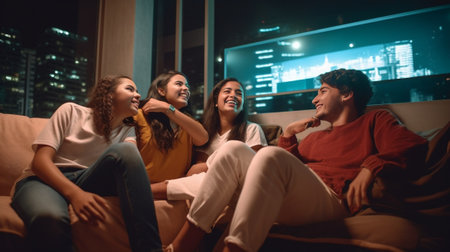 A diverse group of friends gathers indoors, engaged in conversation and laughter. Warm lighting illuminates the scene, highlighting a cozy living room setting with a couch, coffee table, and decorative items. The composition suggests a casual get-together, ideal for commercial or editorial applications.