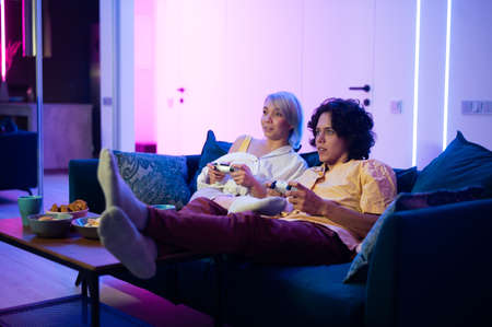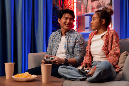 Sitting sofa of happy smiling couple playing video game control by joystick fronted snack and drinks competing challenge level with funny at modern neon blub light comfy living room at home. Infobahn.