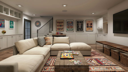 A family room with a sectional sofa, board games, and a coffee table, promoting quality time and bonding among loved ones.