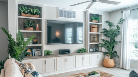Bright living room featuring a cozy sofa with decorative cushions, stylish TV console, and lush indoor plants, all bathed in natural sunlight for a welcoming atmosphere.