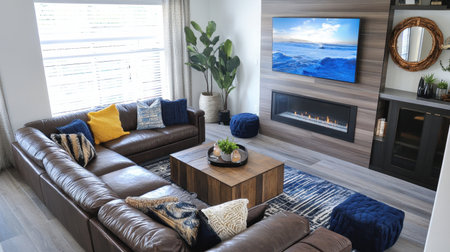 Discover a cozy modern living room featuring stylish furniture, an electric fireplace, lush plants, and vibrant decor that creates a warm atmosphere for relaxation and gatherings.
