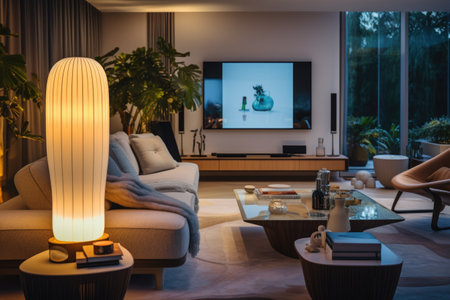 smart home with voice-activated lights, thermostat, and entertainment system, created with generative ai