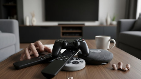Smart home setup with voice-controlled security and entertainment system. That the image is generated using AI.