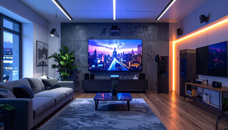 Futuristic living room with a smart technology integration, ambient lighting, large screen, and a cozy sofa set in a modern interior.