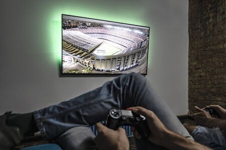 Kiev, Ukraine, September 19, 2018: Two men playing video game. Hands holding console controller. Football or soccer game on the television. Widescreen tv hang on the wall